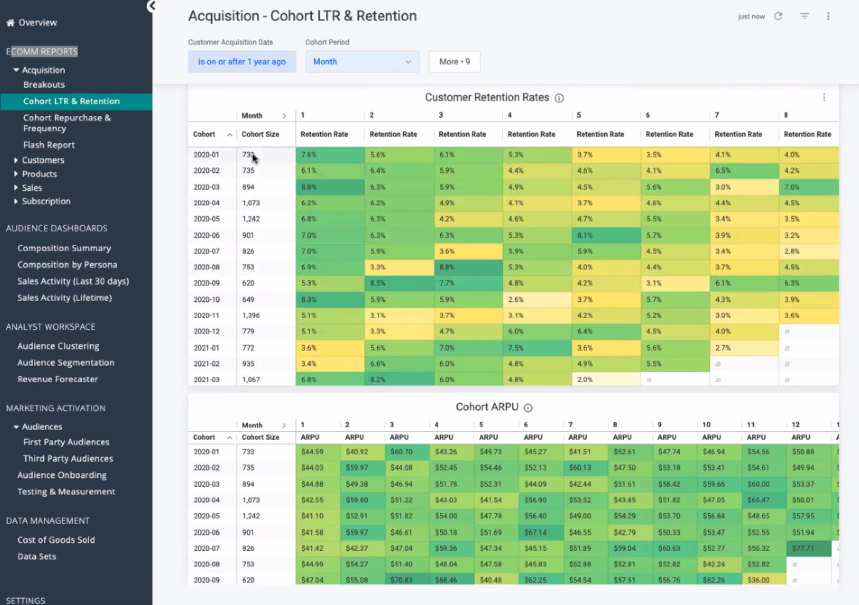 They have dozens of out of the box dashboards that help you understand your: acquisition, retention, lifetime value, median days to second order, and hundreds of other key data points that help you optimize all sorts of components of your business and marketing strategy. From second purchase timing to purchase frequency prediction based on behavior, gender-based revenue analyses, time-based cohorts to product analytics, aggregated by customer, etc.