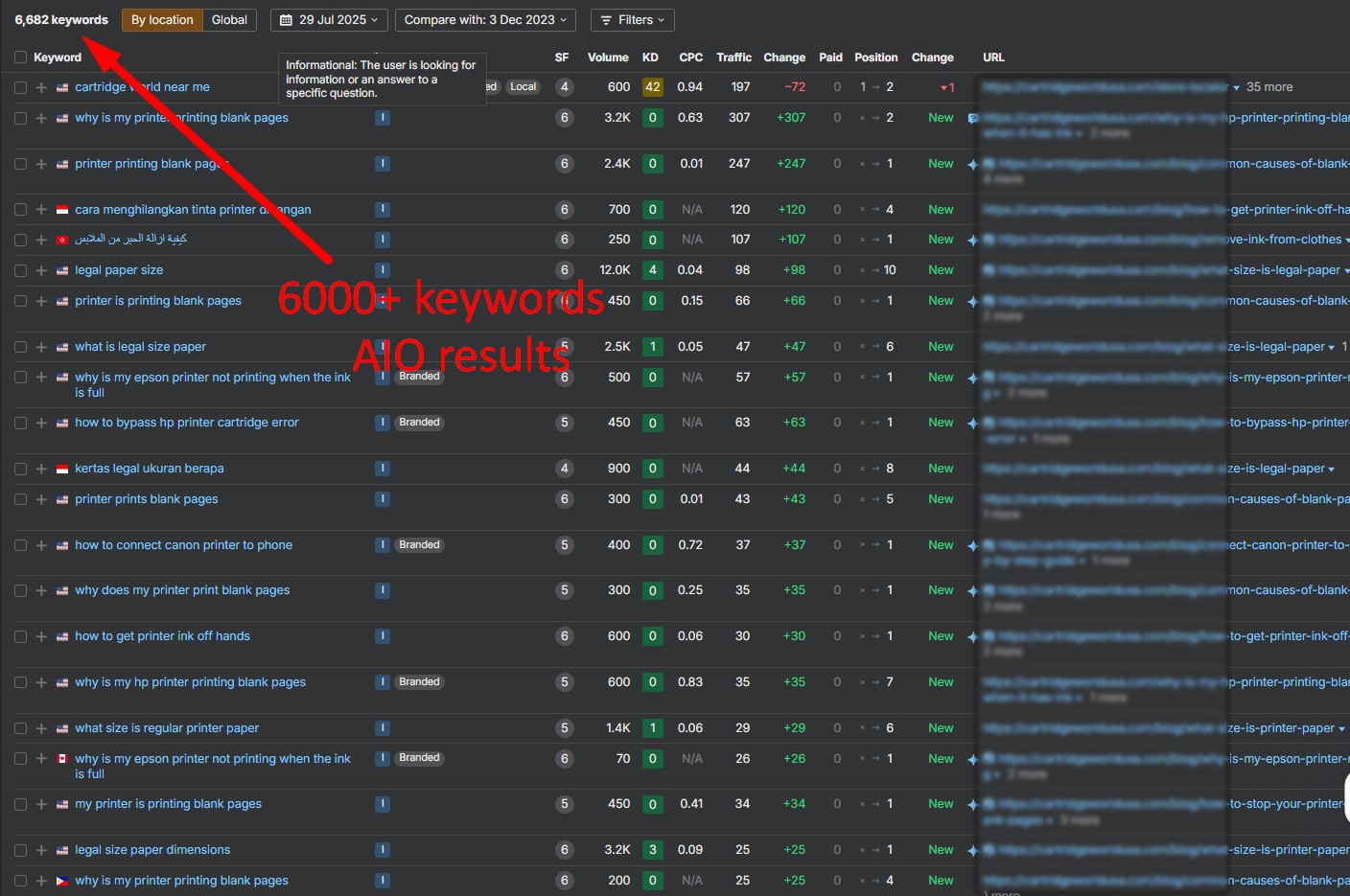 Within a few weeks of publishing optimized content, our client’s website began to appear in dozens of AIO answers, capturing highly visible positions for long-tail and transactional keywords across the printing, ink, and cartridge space.